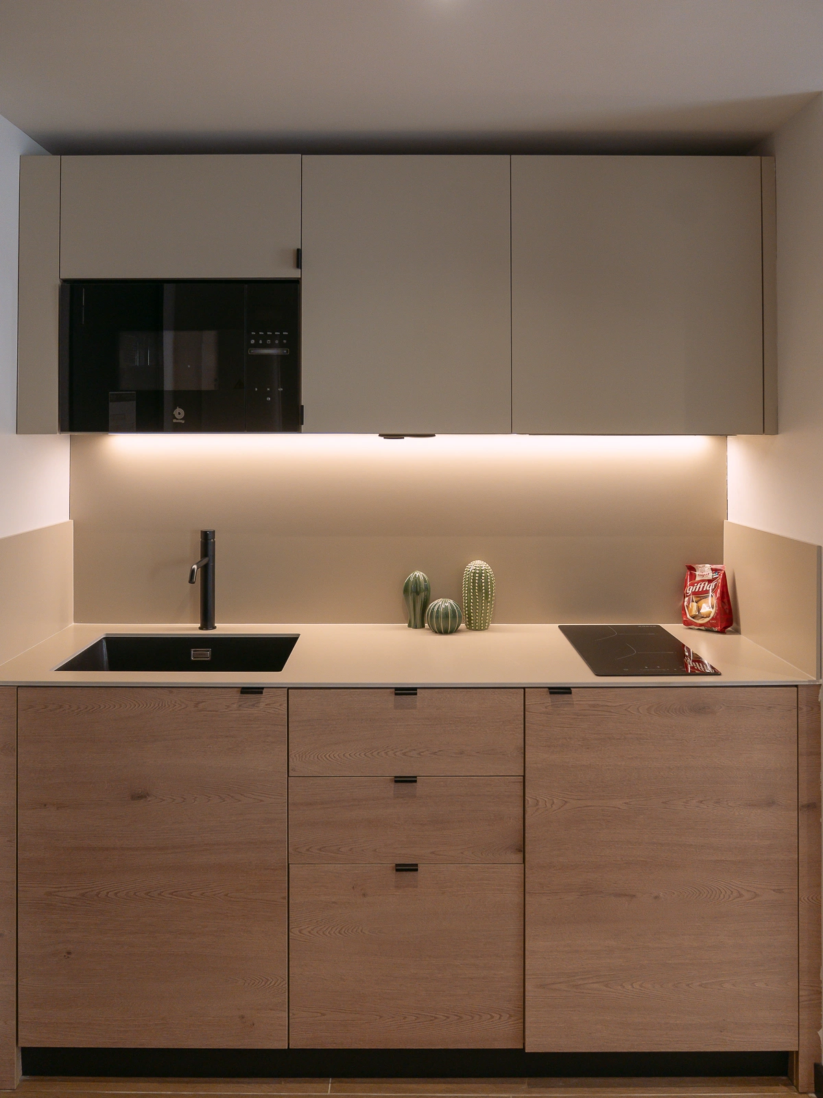 - microwave, fridge/freezer, induction cooktop, kitchenware