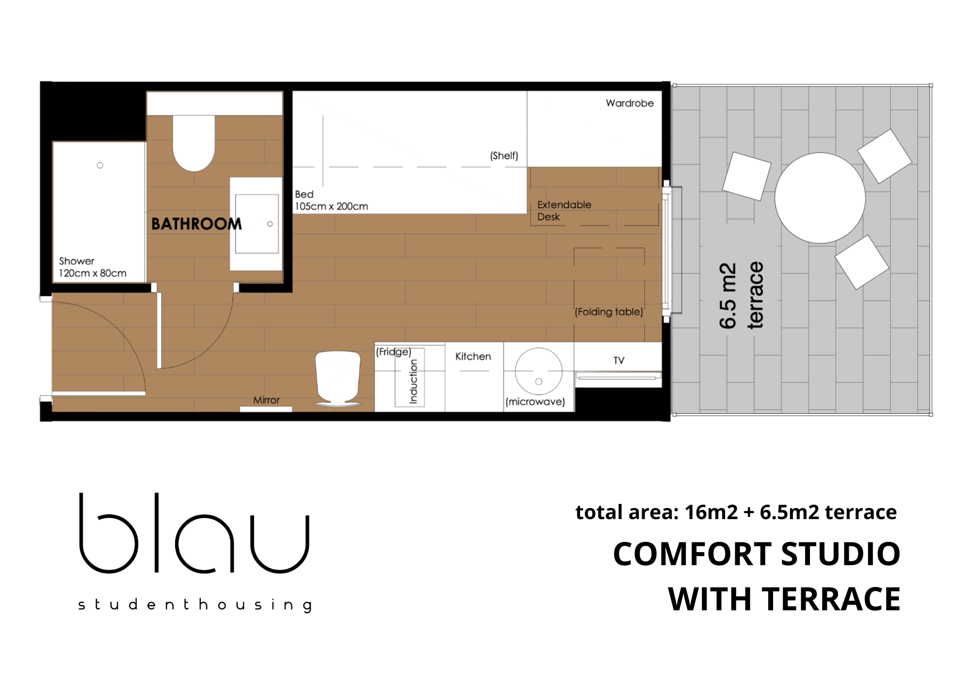 This 16m² single studio features a private terrace(6.5m²), offering a cozy and airy space for comfortable student living.